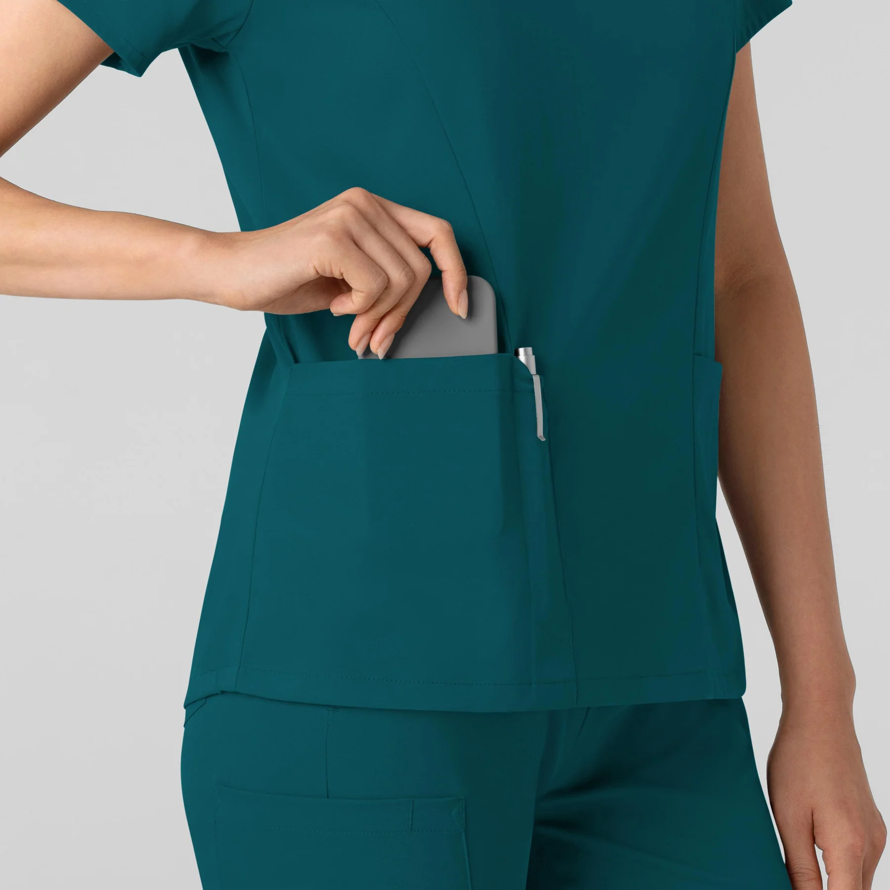 Bluza medicala Boundless cu design modern, guler in V si croiala semi-fit, ideala pentru confort si functionalitate in timpul zilelor aglomerate.