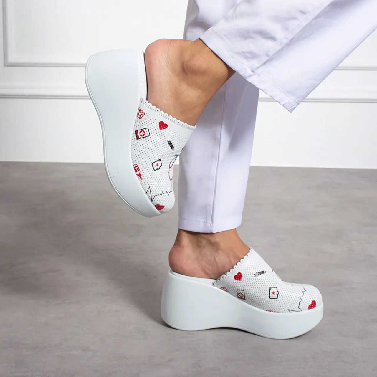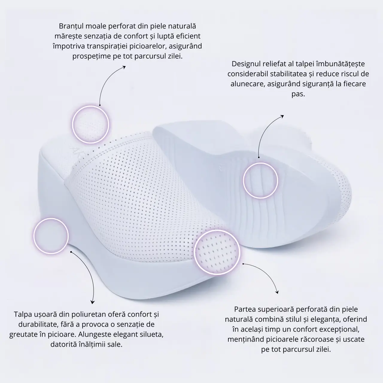 Creati pentru profesionistii din domeniul medical care petrec multe ore in picioare. Realizati integral din piele naturala de inalta calitate, acesti papuci combina designul ergonomic cu o talpa cu platforma inalta, oferind confort, sustinere si stil.