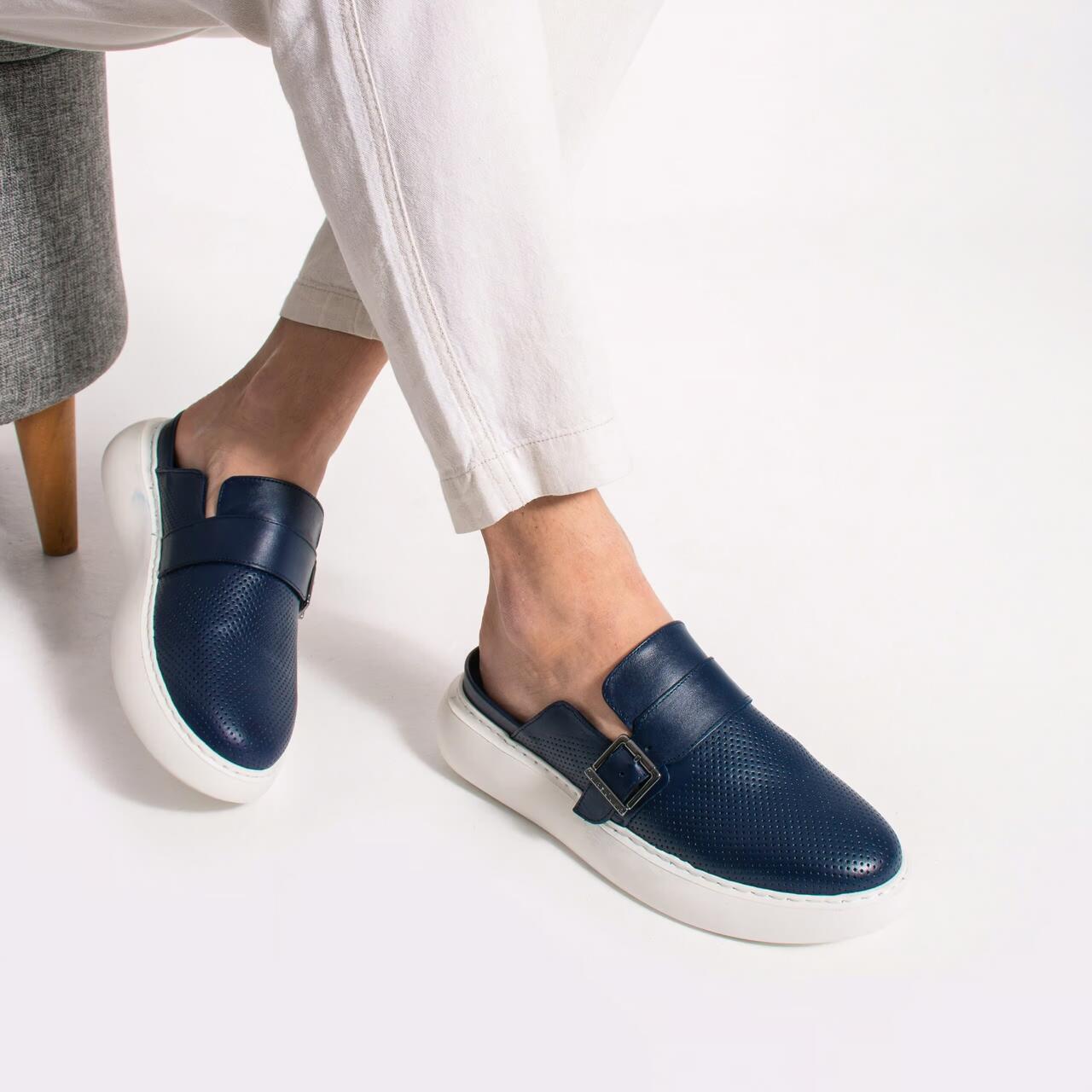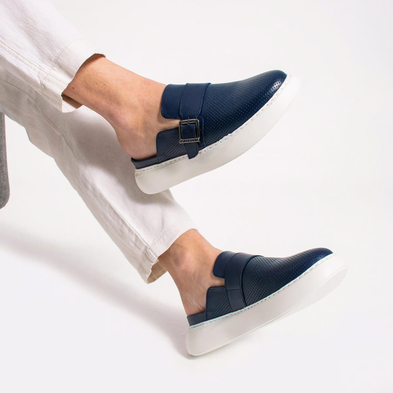 Saboti albastri barbatesti, din piele naturala si catarama reglabila